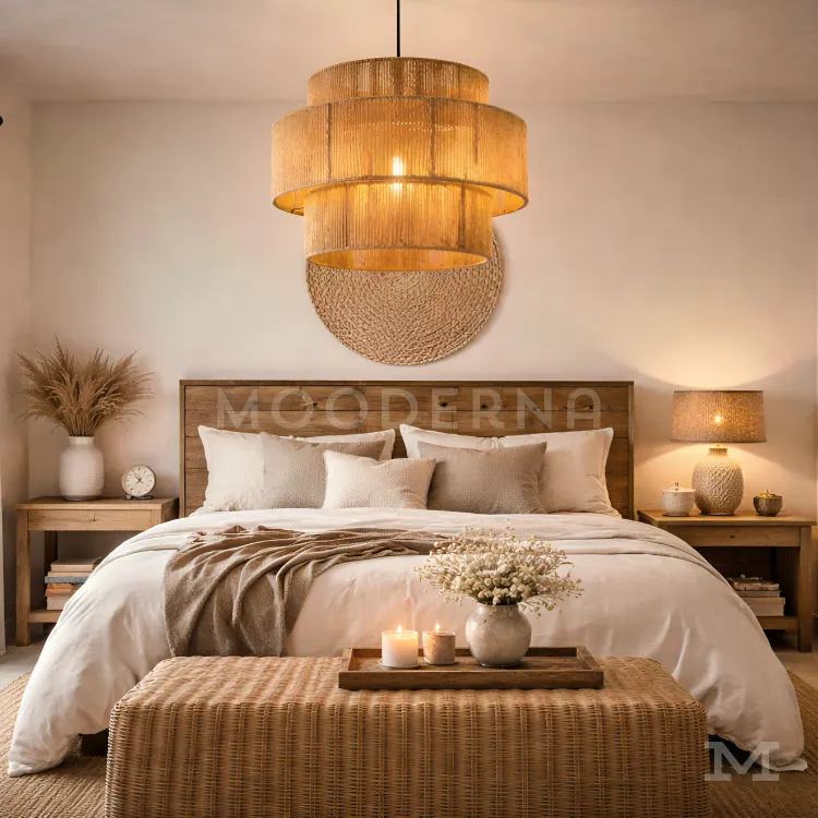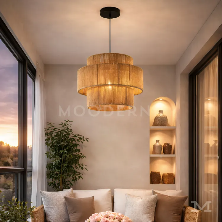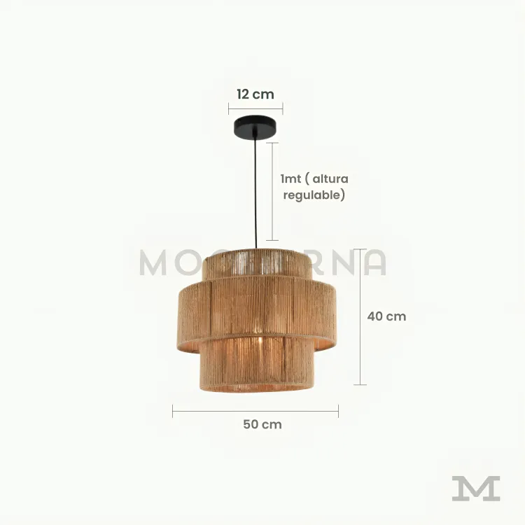 Alva en fondo blanco, destacando su diseño colgante en fibra natural con estructura liviana y estilo artesanal.