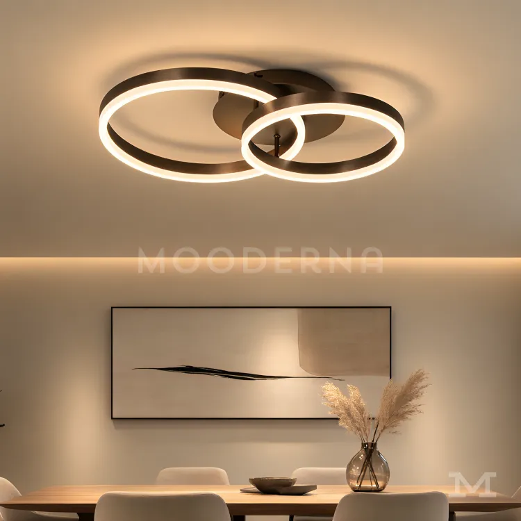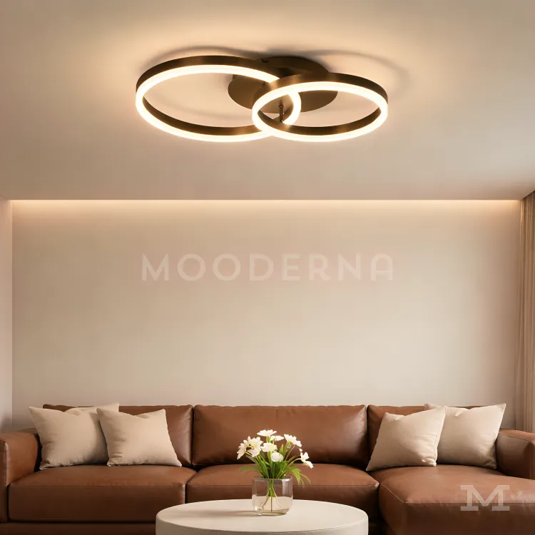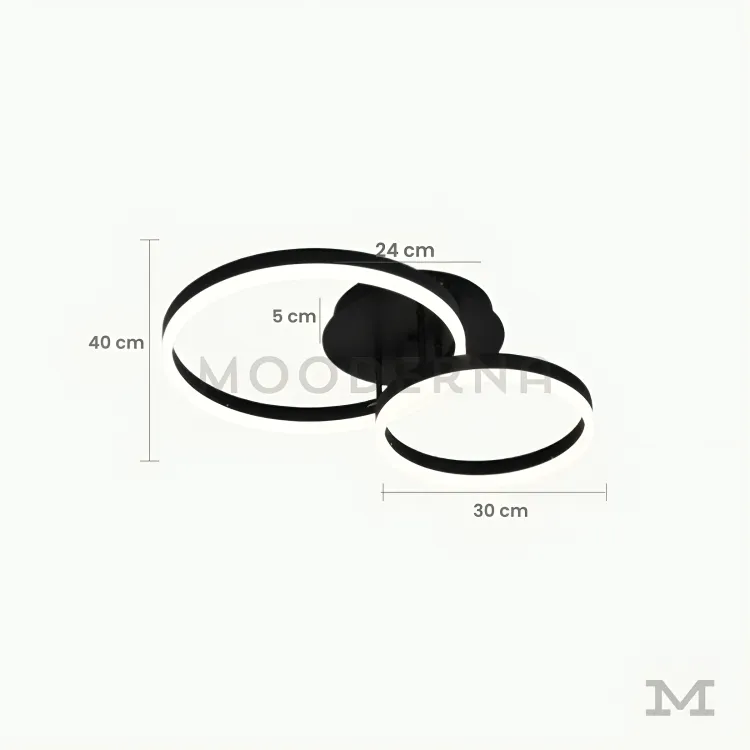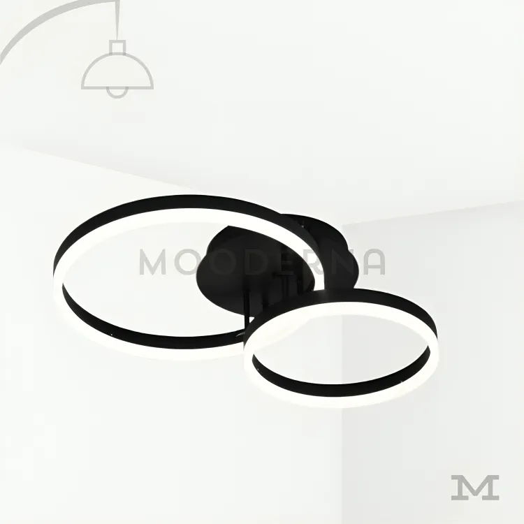 Trueno Black en fondo blanco, destacando su diseño moderno minimalista en color negro con formas circulares LED.