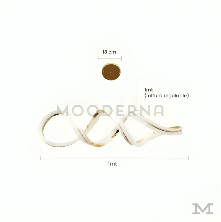 Luminaria Thea Gold sobre fondo blanco con diseño elegante de brazos curvos y acabado dorado satinado. Fabricada en aluminio y acrílico con luz LED integrada, combina estilo clásico y moderno, ideal para realzar comedores o salas con decoración sofisticada.